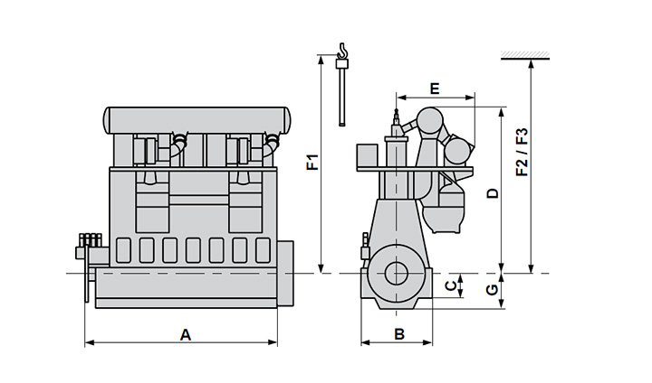| F1: 垂直拆卸活塞时的最低高度 Min height for vertical removal F2: 使用双臂式吊车垂直拆卸活塞时的最低高度 Min height for vertical removal with double-jib crane F3: 使用双臂式吊车倾斜拆卸活塞时的最低高度 Min height for tilted removal with double-jib crane |