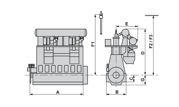 | F1: 垂直拆卸活塞时的最低高度 Min height for vertical removal F2: 使用双臂式吊车垂直拆卸活塞时的最低高度 Min height for vertical removal with double-jib crane F3: 使用双臂式吊车倾斜拆卸活塞时的最低高度 Min height for tilted removal with double-jib crane |