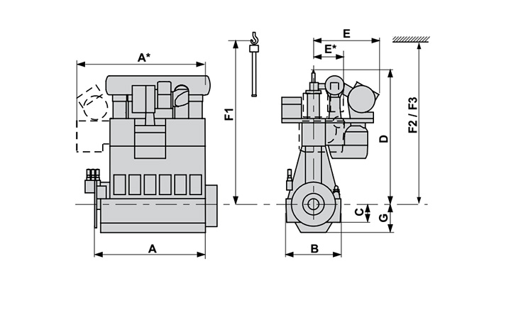 | F1: 垂直拆卸活塞时的最低高度 Min height for vertical removal F2: 使用双臂式吊车垂直拆卸活塞时的最低高度 Min height for vertical removal with double-jib crane F3: 使用双臂式吊车倾斜拆卸活塞时的最低高度 Min height for tilted removal with double-jib crane |