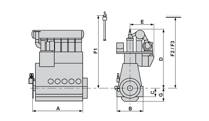 | F1: 垂直拆卸活塞时的最低高度 Min height for vertical removal F2: 使用双臂式吊车垂直拆卸活塞时的最低高度 Min height for vertical removal with double-jib crane F3: 使用双臂式吊车倾斜拆卸活塞时的最低高度 Min height for tilted removal with double-jib crane |